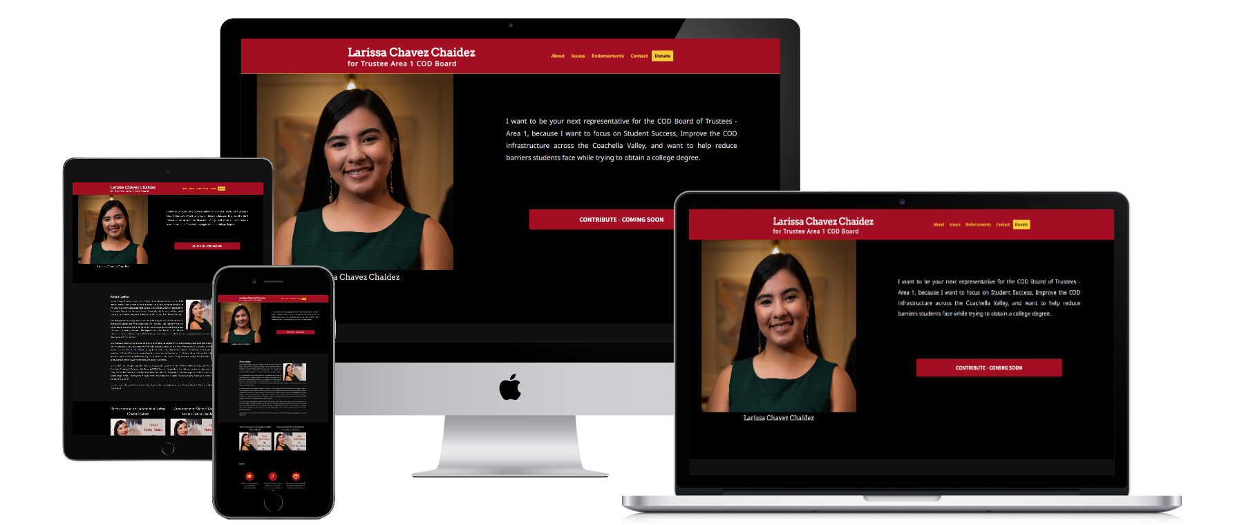Designed a bold and accessible campaign site for Larissa Chavez, focused on student-first messaging and community involvement. The site features clear bilingual content, mobile responsiveness, donation tools, and detailed platform priorities.